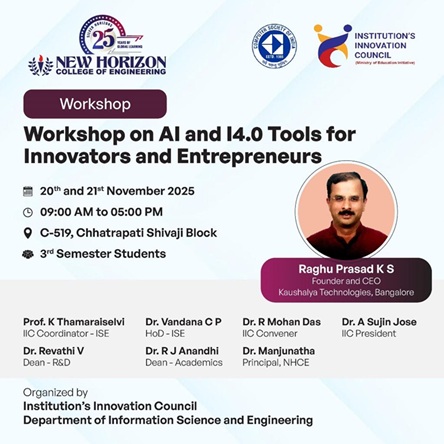 SEMINARS AND WORKSHOPS Workshop on AI and I4.0 Tools for Innovators and Entrepreneurs The Department of Information Science and Engineering, in association with NHCE IIC, organised a workshop on AI and Industry 4.0 Tools for Innovators and Entrepreneurs from 20th to 21st November 2025. The objective of the workshop was to teach participants the fundamentals […]